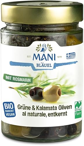 Обработка: лучшее из обоих сортов — смесь фруктовых оливок Каламата, сертифицированных ярмаркой Naturland, и острых органически сертифицированных оливок Консерволия. Греческие фермеры традиционно выращивают оливковые деревья и собирают урожай в основном вручную. Оливки естественным образом удаляют горечь, маринуют в изысканном оливковом масле Mani с розмарином и тонкой ноткой винного уксуса и напрямую упаковывают в вакуум. Чистый вкус благородных оливок в сыром виде. Mani является пионером в области органического оливкового масла и оливок из Греции. В 1991 году семейный бизнес получил самый первый органический сертификат в Греции на свое оливковое масло. Обработка/приготовление: смесь оливок с розмарином придает блюдам особый средиземноморский оттенок и идеально подходит в качестве гарнира к жареным овощам, рыбе или греческим салатам. Благодаря своему мягкому, сочному вкусу и фруктовому аромату оливки с розмарином также идеально подходят в качестве закуски или перекуса на ходу. Сертификация/ru * V-образный знак (веганский) * Органический знак ЕС Ингредиенты Оливки Каламата*º (46,85%), зеленые оливки*º (46,85%), оливковое масло первого отжима*, морская соль, винный уксус*, розмарин* (0,3%)ºСертифицировано Natureland Fair (93,7%) Предупреждение об опасности Информация об аллергенах: нет (без анализа): злаки, содержащие глютен, пшеница, пшеница кохора, полба, рожь, ячмень, овес, ракообразные, яйца, рыба, арахис, соя, молоко, лактоза, орехи, миндаль, фундук, грецкие орехи, кешью, пекан, бразильские орехи, фисташки, орехи макадамия, сусло, сусло, сусло, кунжут, сульфит, люпин, моллюски Может содержать кусочки ядра. Контактная информация производителя ферментированного продукта Bläuel Greek Organic Products Frintrix M; ; 24024 West Mani